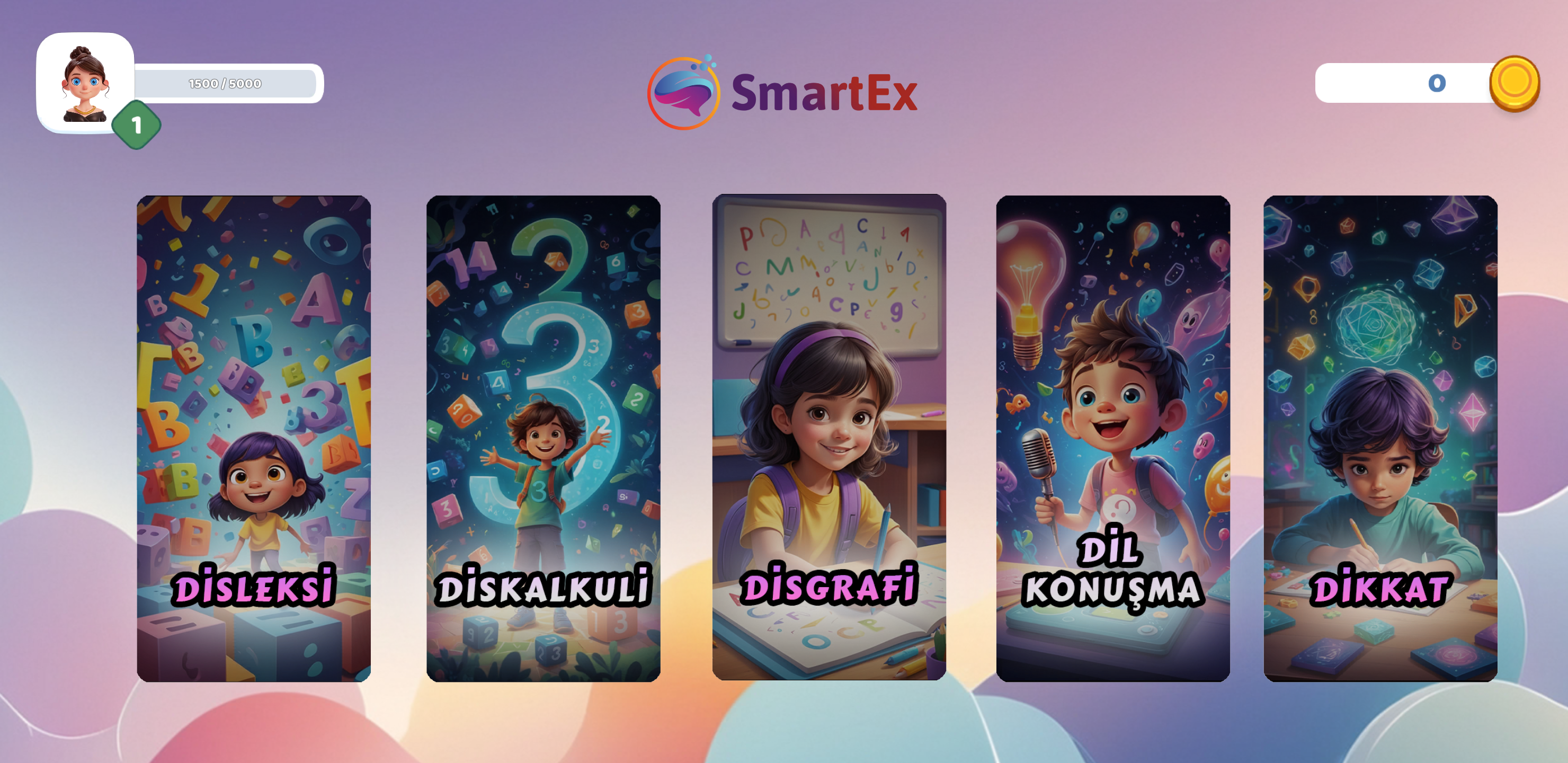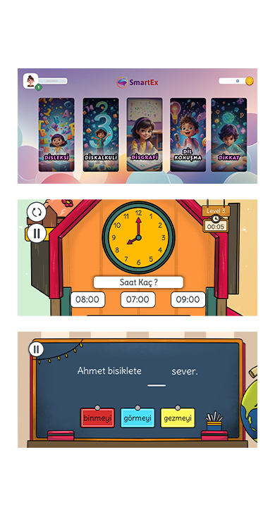Smartex dünyası birbirinden zengin içerikleriyle disleksi, diskalkuli, disgrafi, dil-konuşma, dikkat ve odaklanma gibi bölümlere ayrılmıştır.